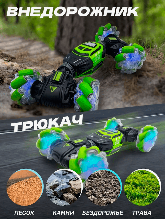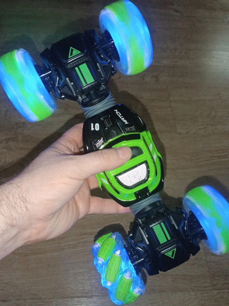 Машинка на пульте управления Skidding Stunt car – трюковая машина-перевертыш. Машинка на радиоуправлении и управлении жестами выполняет функции как гоночная машинка, как машинка вездеход, обладает повышенной проходимостью: ездит по бездорожью, песку, камням, траве благодаря наличию полного привода 4WD.